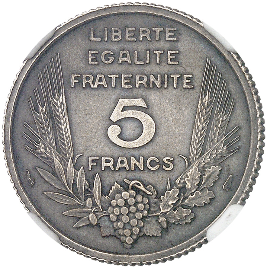 - IIIe République (1870-1940). Essai de frappe uniface de revers en argent de 5 francs Bazor, Flan bruni mat (PROOF MATTE) ND (1933), Paris.