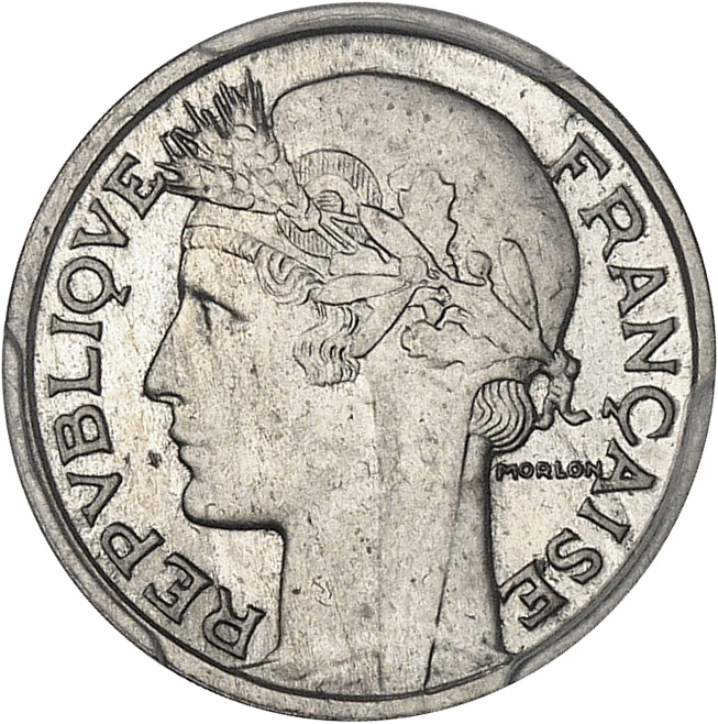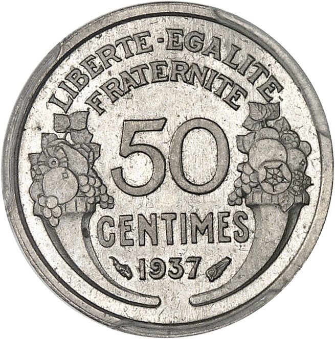 - IIIe République (1870-1940). Essai de 50 centimes Morlon en maillechort, Frappe spéciale (SP) 1937, Paris.