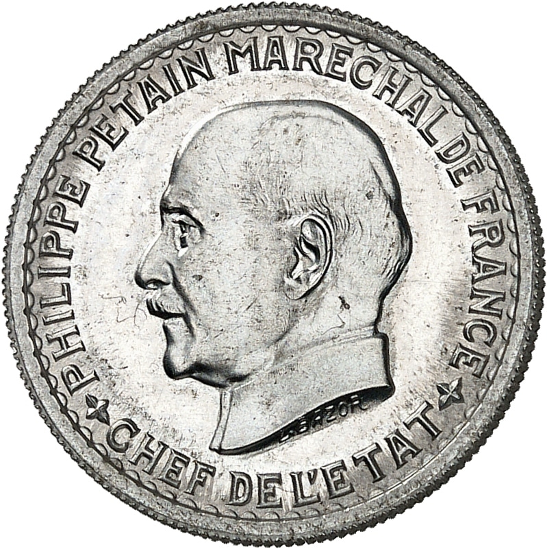 Rv. TRAVAIL FAMILLE PATRIE. Bâton de maréchal noué avec deux francisques, accosté de 5 - F et des (différents) ; au-dessous (date) ; ESSAI à droite.