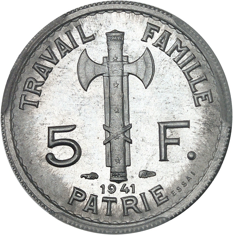 - État Français (1940-1944). Essai de 5 francs Pétain, type définitif, en aluminium, Frappe spéciale (SP) 1941, Paris.