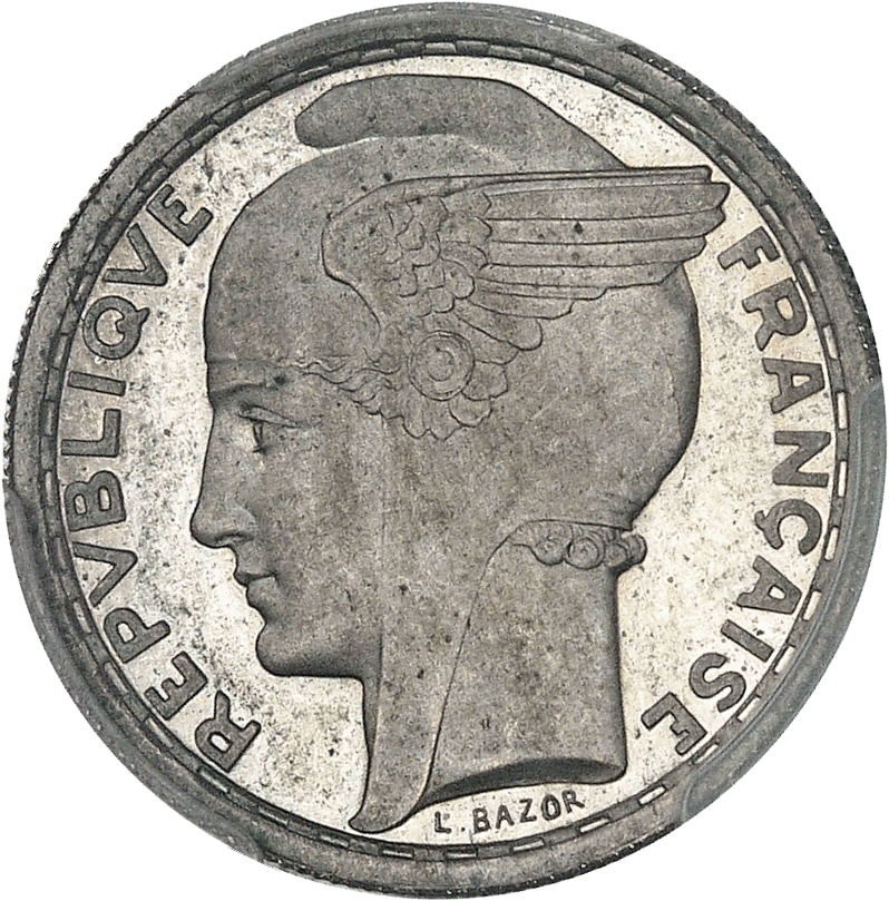 Av. REPVBLIQVE FRANÇAISE. Tête de la République à gauche, avec bonnet phrygien orné d’une aile, signature L. BAZOR.