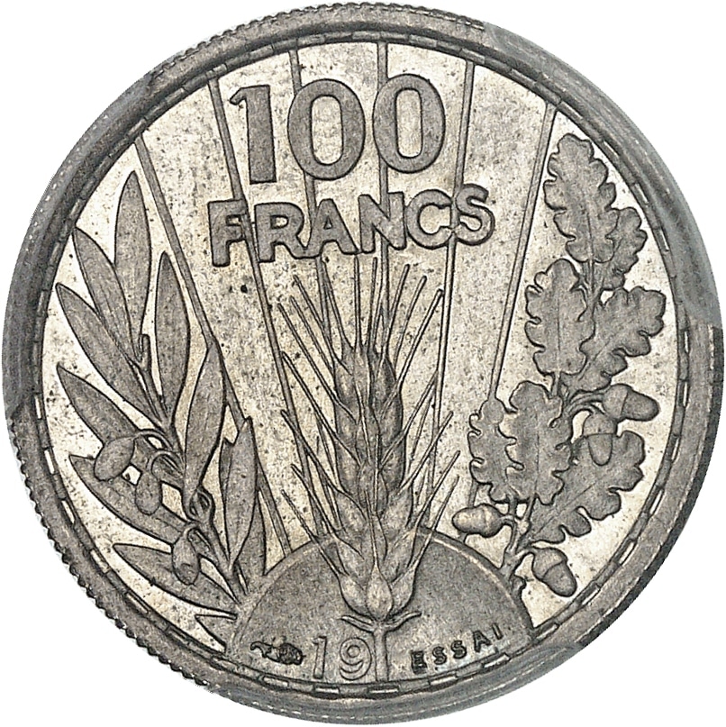 Rv. 100 FRANCS. Épi entre une branche d’olivier et une branche de chêne ; à l’exergue (différent) 19[--] et ESSAI.