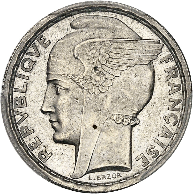 Av. REPVBLIQVE FRANÇAISE. Tête de la République à gauche, avec bonnet phrygien orné d’une aile, signature L. BAZOR.