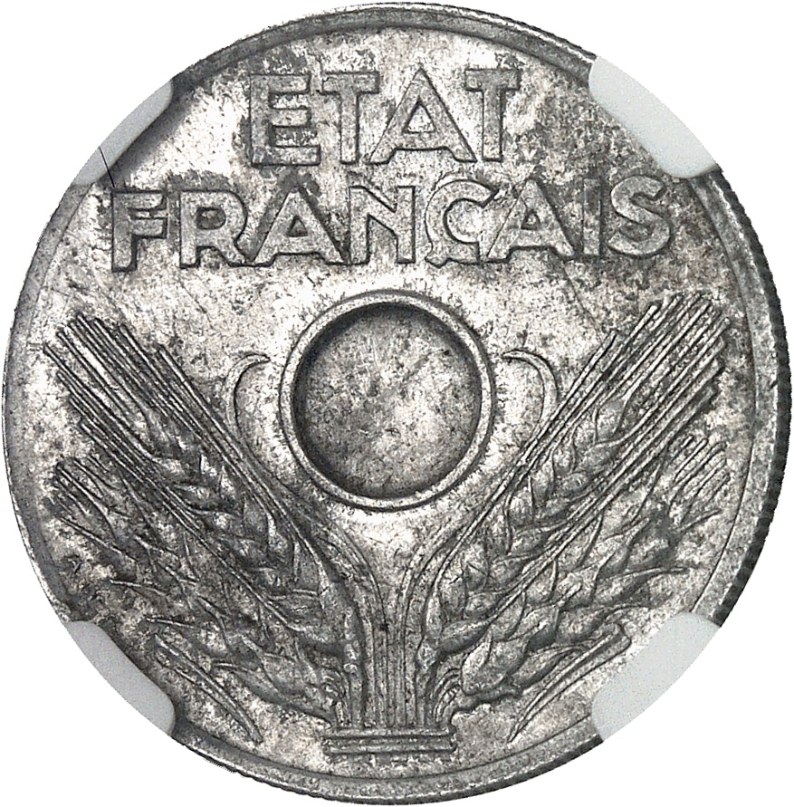 Av. ETAT FRANÇAIS. Au-dessous de l’emplacement du trou central, quatre épis de blés maintenus par une bague ; signature A. DE G.