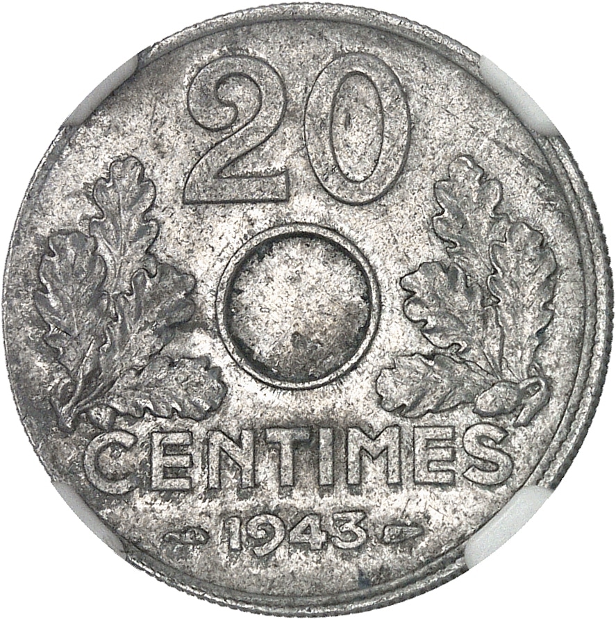 - État Français (1940-1944). Épreuve de 20 centimes en alliage composite (palladium, cadmium, etc..) 1943, Paris.