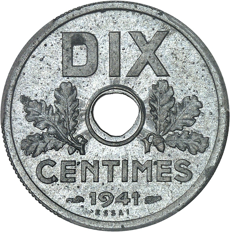 - État Français (1940-1944). Essai de DIX centimes, grand module, Frappe spéciale (SP) 1941, Paris.