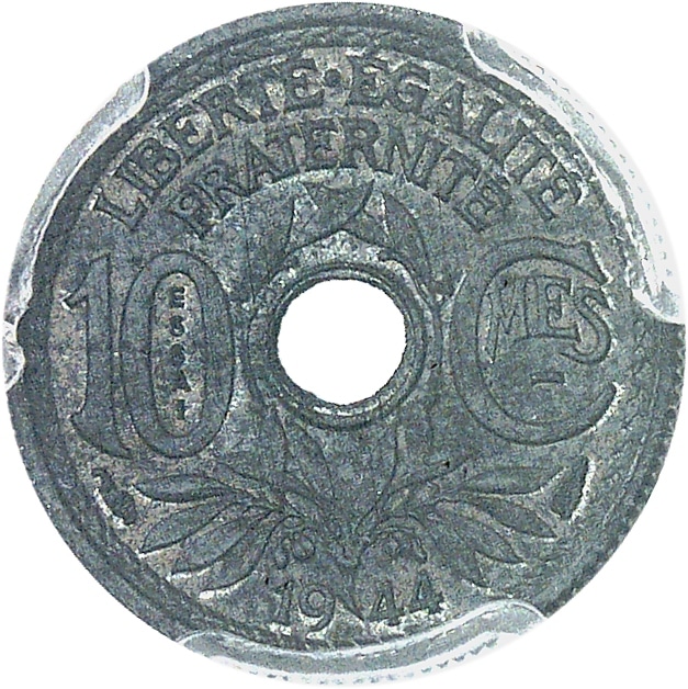 - État Français (1940-1944). Essai de 10 centimes Lindauer, petit module, Frappe spéciale (SP) 1944, Paris.