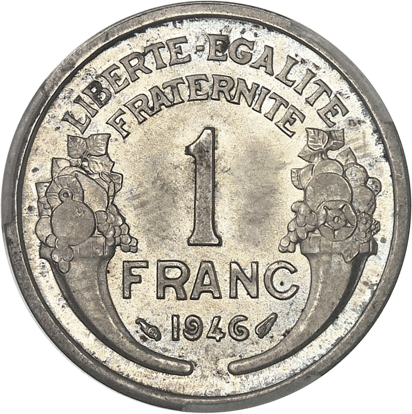 - Gouvernement provisoire de la République française (1944-1946). Épreuve de 1 franc Morlon en argent, de poids léger, Frappe spéciale (SP) 1946, Paris.