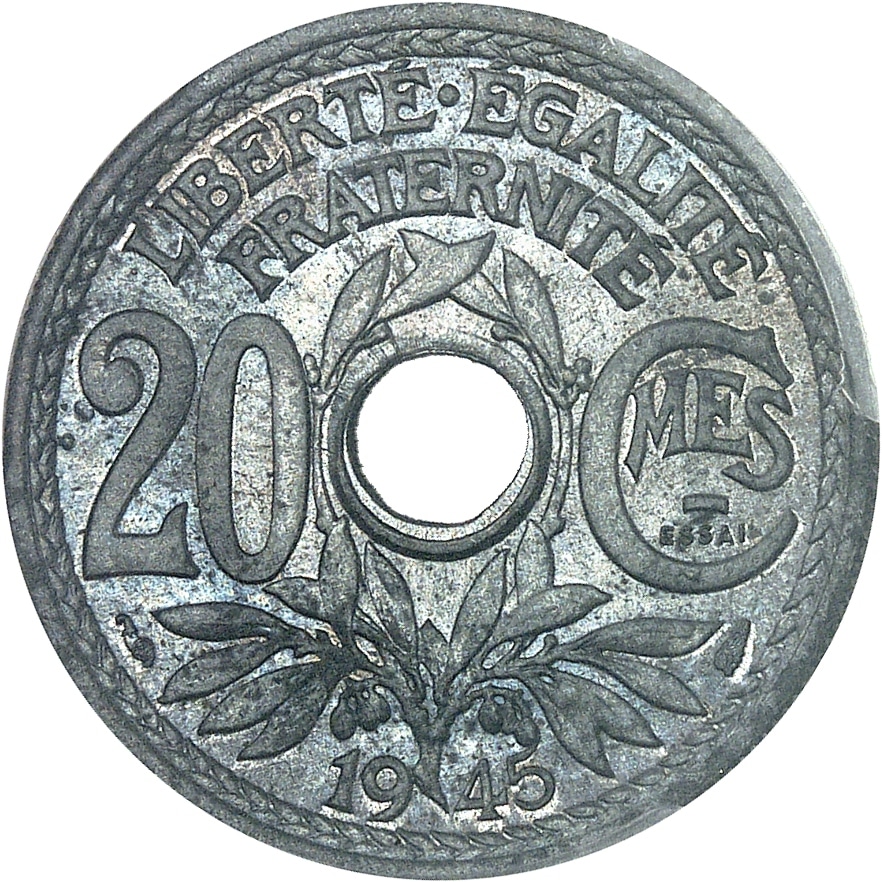 - Gouvernement provisoire de la République française (1944-1946). Essai de 20 centimes Lindauer, Frappe spéciale (SP) 1945, Paris.