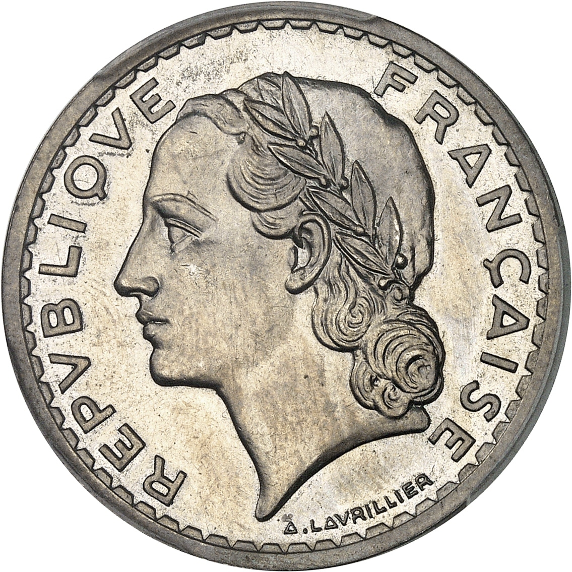 - IVe République (1947-1958). Essai de 5 francs Lavrillier en cupro-nickel, de poids 11 g, Frappe spéciale (SP) 1947, Paris.