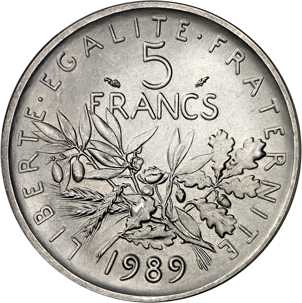 - Ve République (1958 à nos jours). Piéfort de 5 francs Semeuse en argent, Frappe spéciale (SP) 1989, Pessac.
