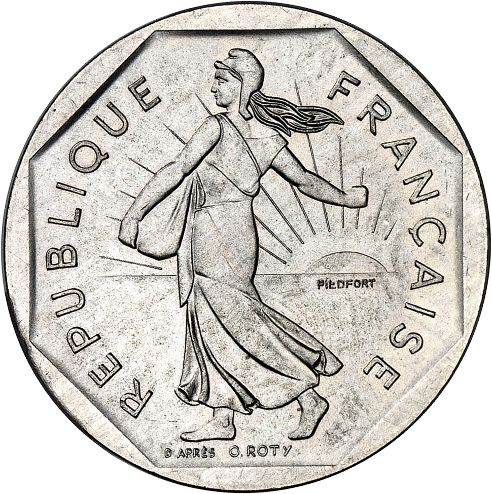 Av. REPUBLIQUE FRANÇAISE. La Semeuse à gauche, avec le soleil levant, marchant et semant à contre-vent, dans un champ octogonal ; signature D’APRÈS O. ROTY ; PIEDFORT dans le champ.