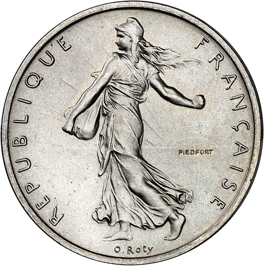 Av. REPUBLIQUE FRANÇAISE. La Semeuse à gauche, avec le soleil levant, marchant et semant à contre-vent ; signature O. ROTY ; PIEDFORT dans le champ.