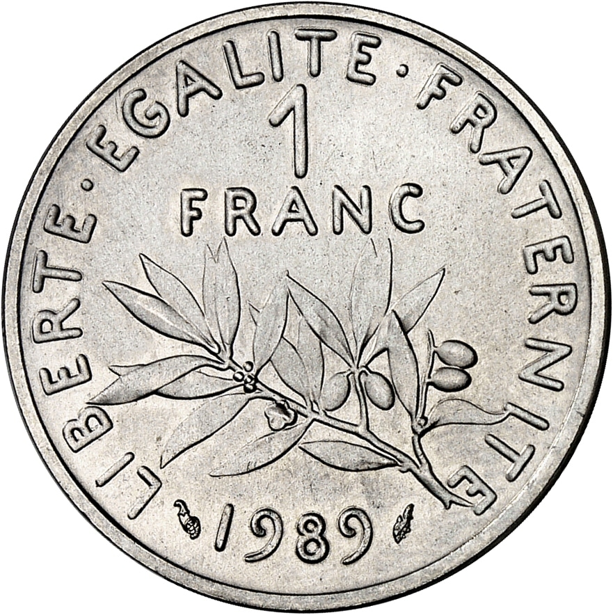 - Ve République (1958 à nos jours). Piéfort de 1 franc Semeuse en argent, Frappe spéciale (SP) 1989, Pessac.