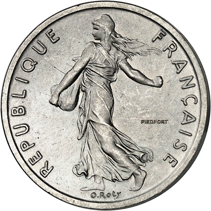 Av. REPUBLIQUE FRANÇAISE. La Semeuse à gauche, avec le soleil levant, marchant et semant à contre-vent ; signature O. ROTY ; PIEDFORT dans le champ.