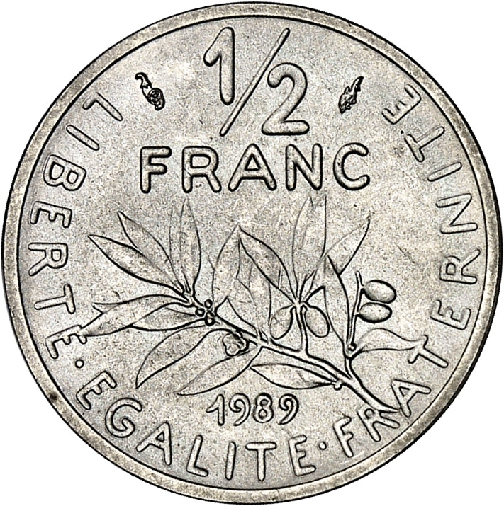 Rv. LIBERTE. EGALITE. FRATERNITE (date). (différent) 1/2 (différent) FRANC et au-dessous une branche d’olivier.