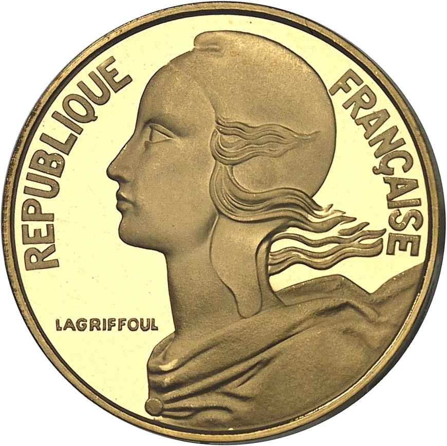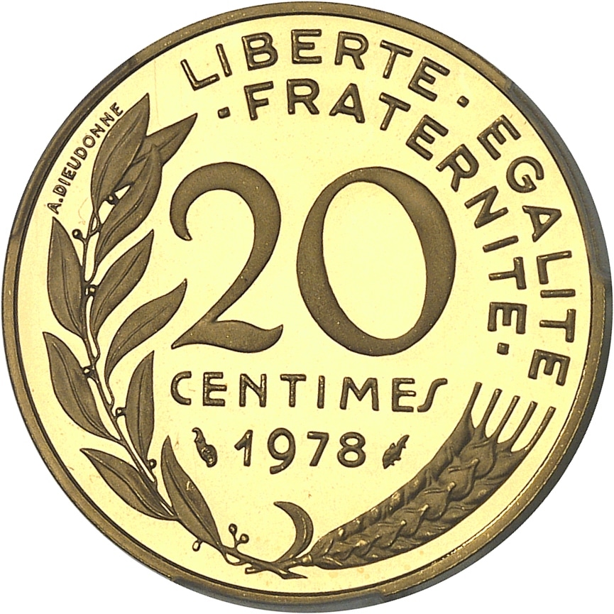 - Ve République (1958 à nos jours). Piéfort de 20 centimes Marianne en or, Frappe spéciale (SP) 1978, Pessac.