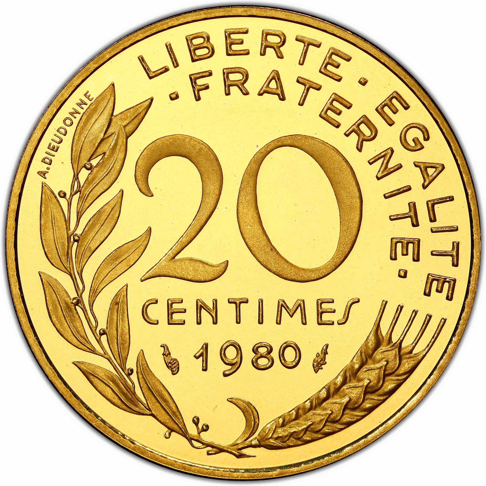 - Ve République (1958 à nos jours). Piéfort de 20 centimes Marianne en or, Frappe spéciale (SP) 1980, Pessac.