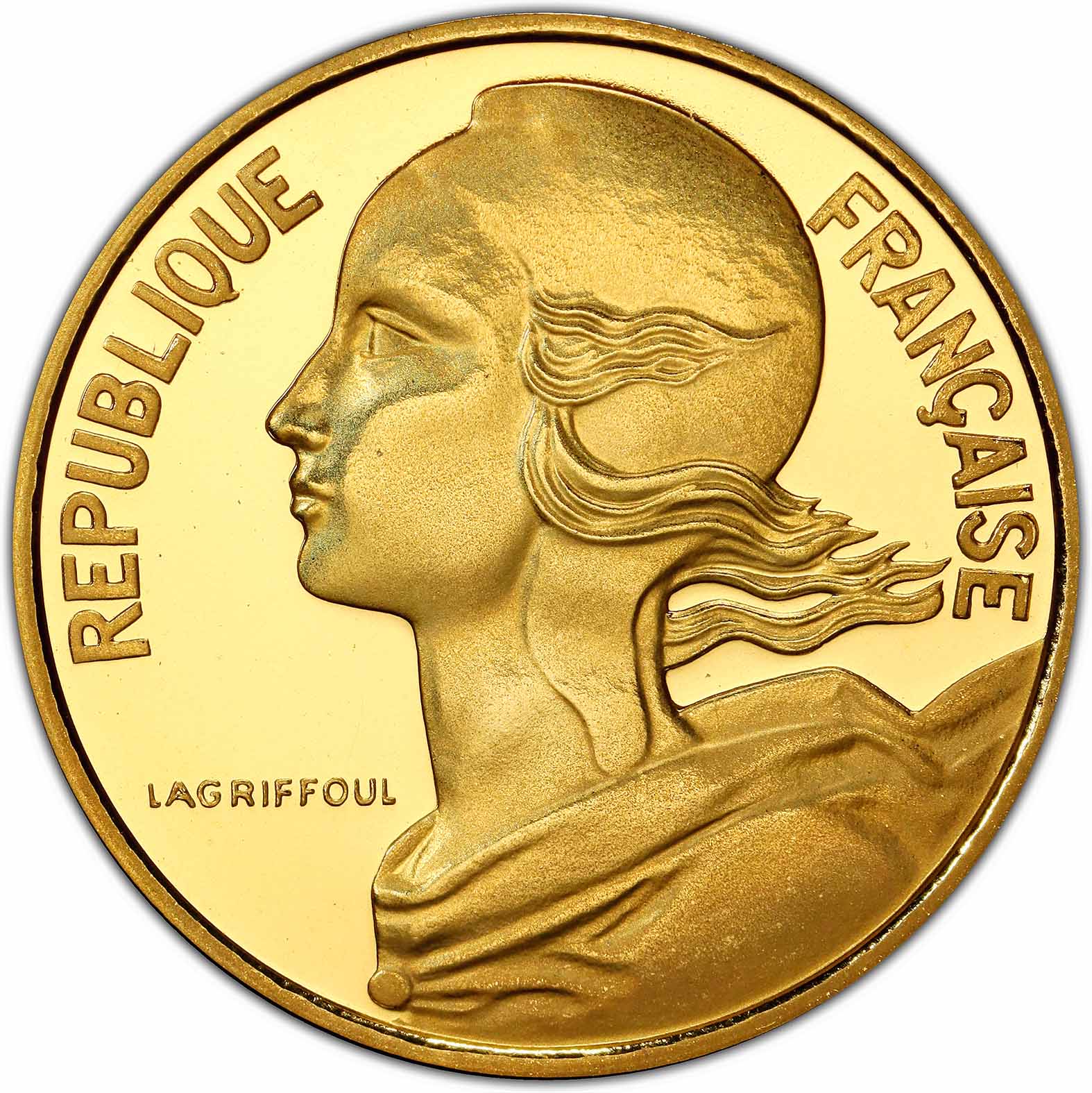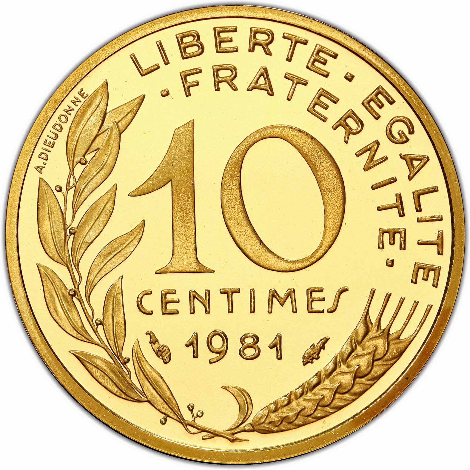 - Ve République (1958 à nos jours). Piéfort de 10 centimes Marianne en or, Frappe spéciale (SP) 1981, Pessac.