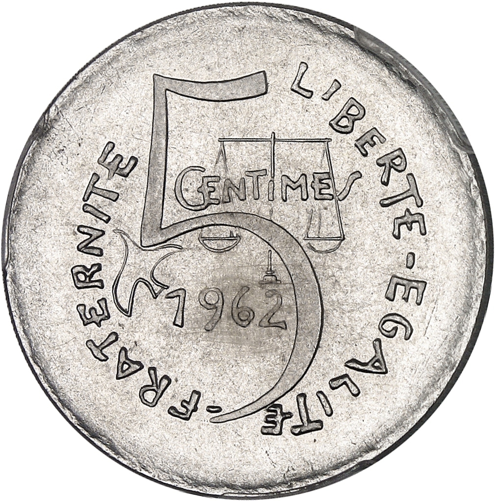- Ve République (1958 à nos jours). Épreuve de 5 centimes, premier projet de R. Joly, grand module, Frappe spéciale (SP) 1962, Paris.