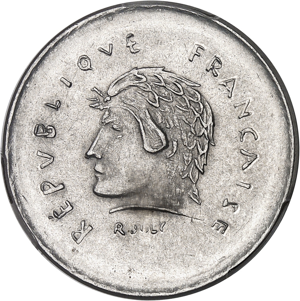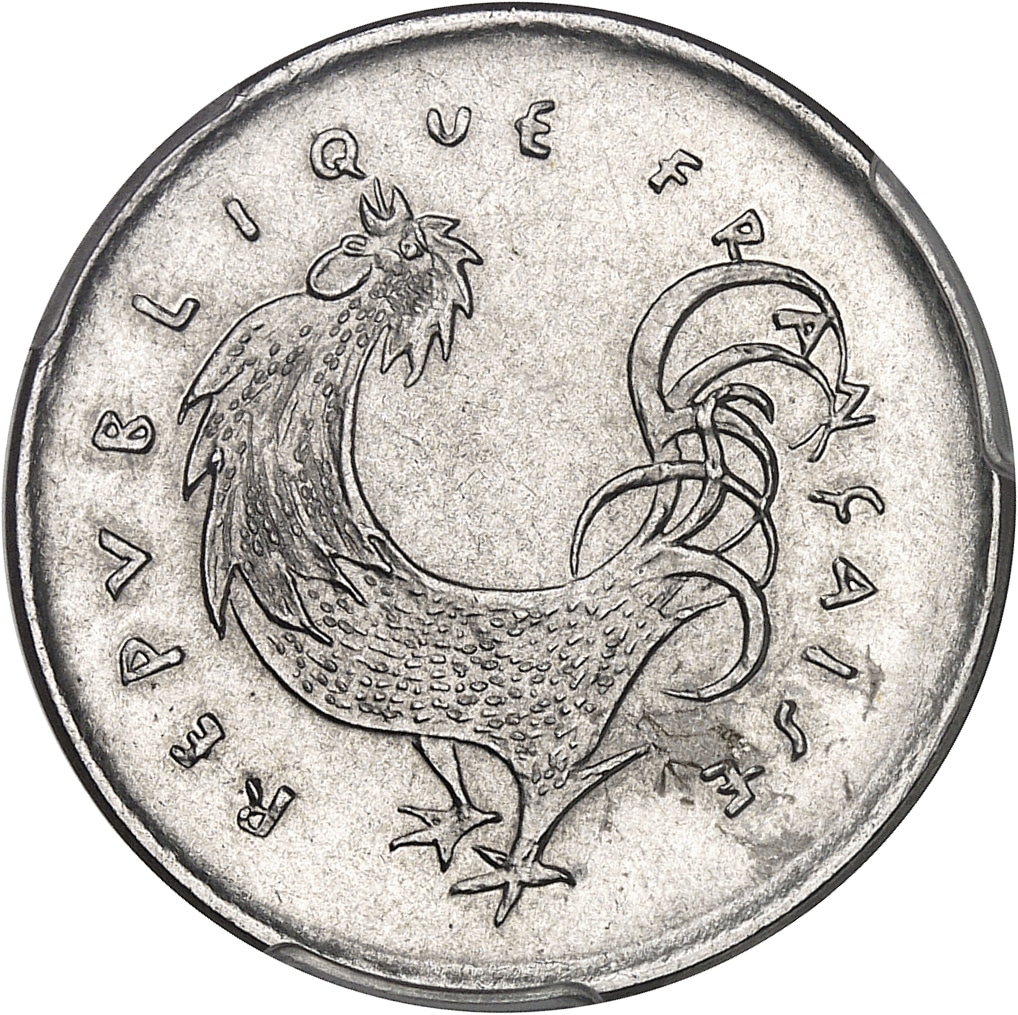 - Ve République (1958 à nos jours). Épreuve de 5 centimes, hybride des premier et deuxième projets d’avers de R. Joly, grand module, Frappe spéciale (SP) ND (1962-1964), Paris.