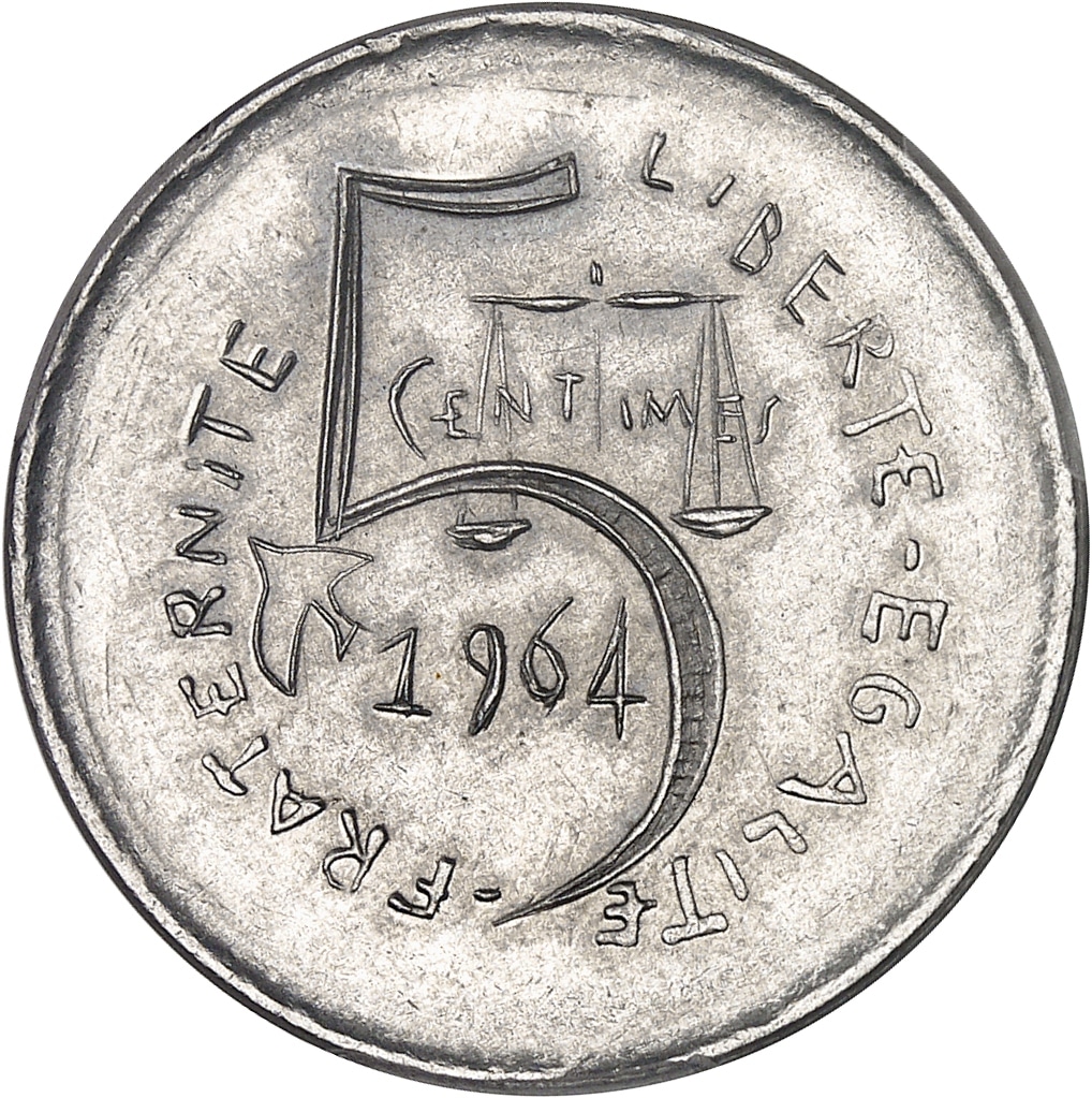 - Ve République (1958 à nos jours). Épreuve de 5 centimes, deuxième projet de R. Joly, grand module, Frappe spéciale (SP) 1964, Paris.