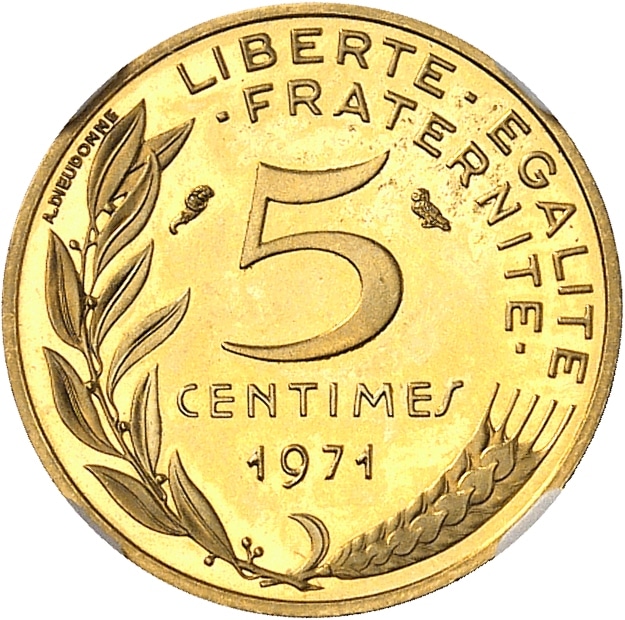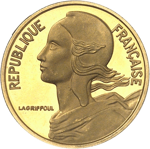 - Ve République (1958 à nos jours). Piéfort de 5 centimes Marianne en or, Flan bruni (PROOF) 1971, Paris.