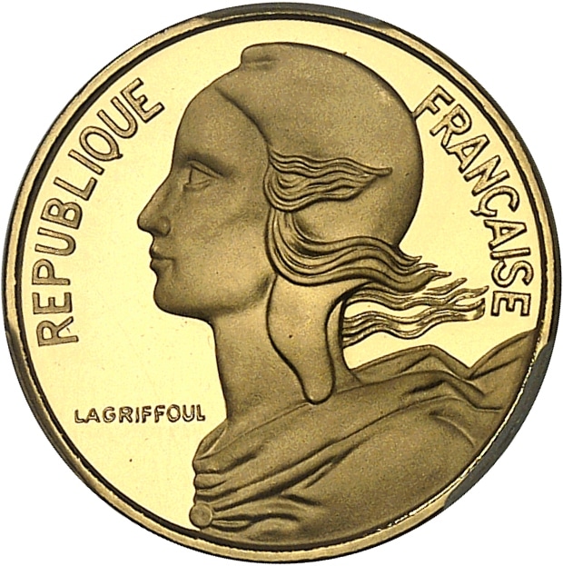 - Ve République (1958 à nos jours). Piéfort de 5 centimes Marianne en or, Frappe spéciale (SP) 1978, Pessac.