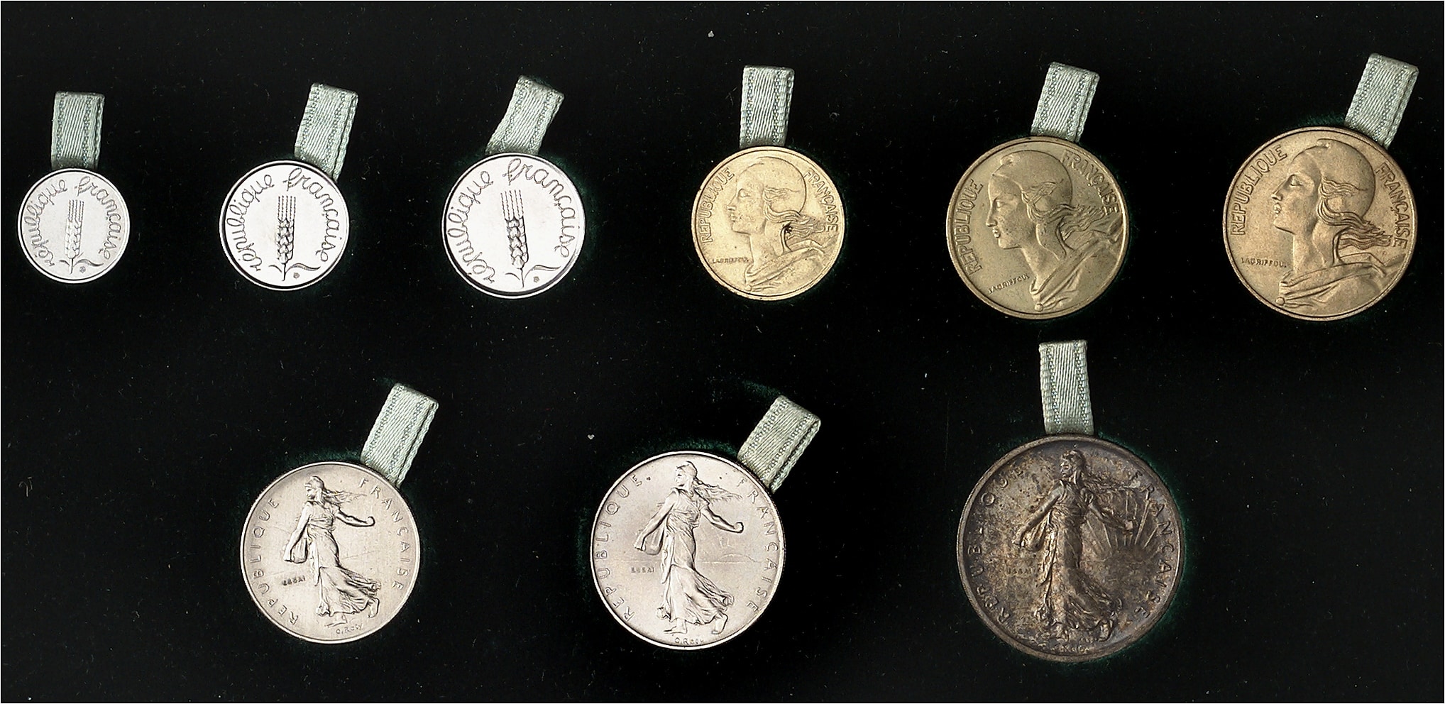 - Ve République (1958 à nos jours). Coffret de présentation de la Commission monétaire, avec 9 essais (5, 2 et 1 francs ; 50, 20 et 10 centimes ; 5, 2 et 1 centimes) 1959-1961-1962, Paris.