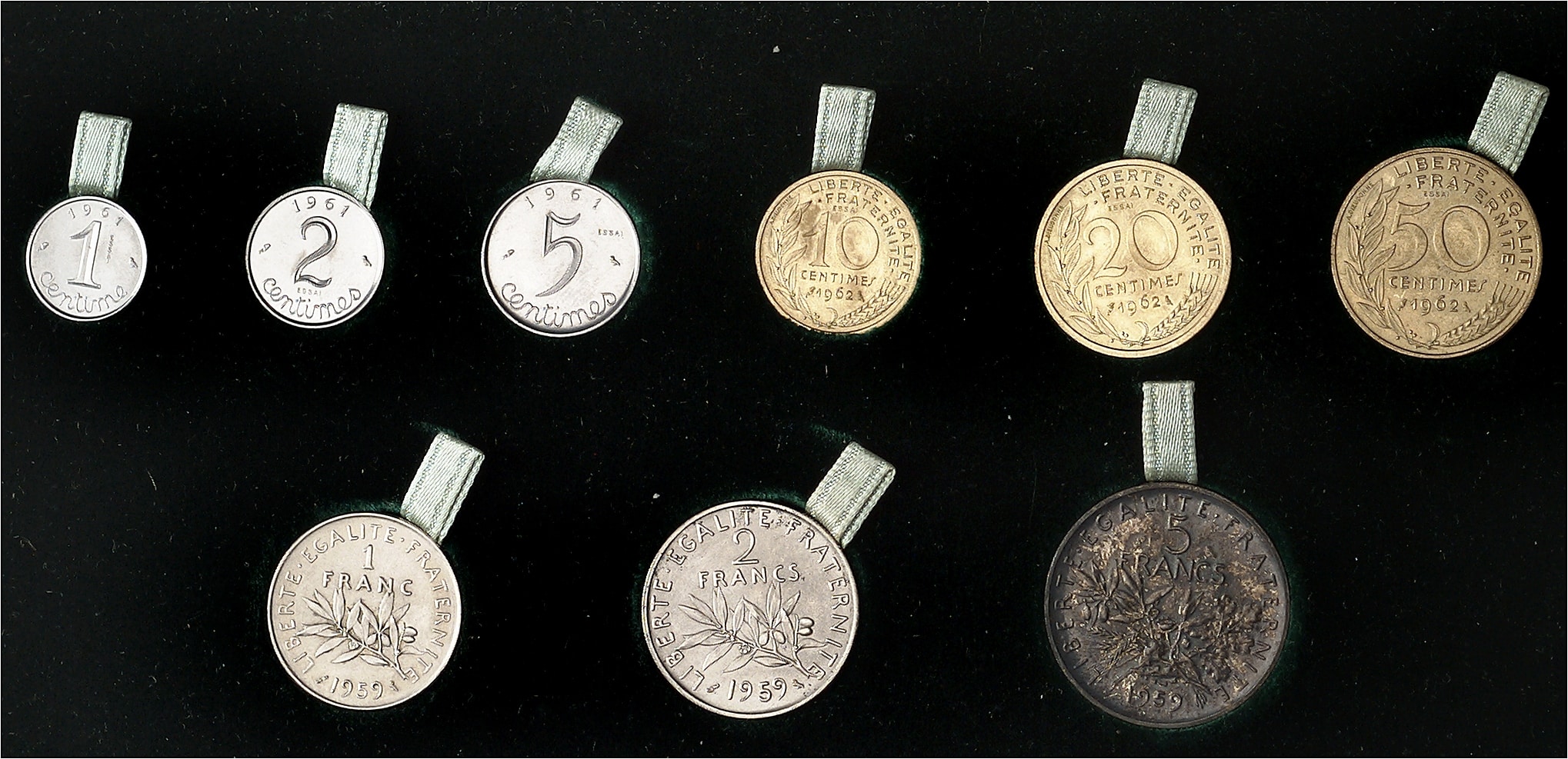 Dans le coffret d’origine de la Commission monétaire avec neuf essais : 5 francs Semeuse 1959 (argent - 12,02 g) ; 2 francs Semeuse 1959 (nickel - 8,31 g) ; 1 franc Semeuse 1959 (nickel - 5,92 g) ; 50 centimes Lagriffoul 1962 (cupro-aluminium-nickel - 6,81 g) ; 20 centimes Lagriffoul 1962 (cupro-aluminium-nickel - 3,98 g) ; 10 centimes Lagriffoul 1962 (cupro-aluminium-nickel - 2,96 g) ; 5 centimes épi 1961 (acier - 3,4 g) ; 2 centimes épi 1961 (acier - 2,3 g) et 1 centime épi 1961 (acier - 1,63 g)