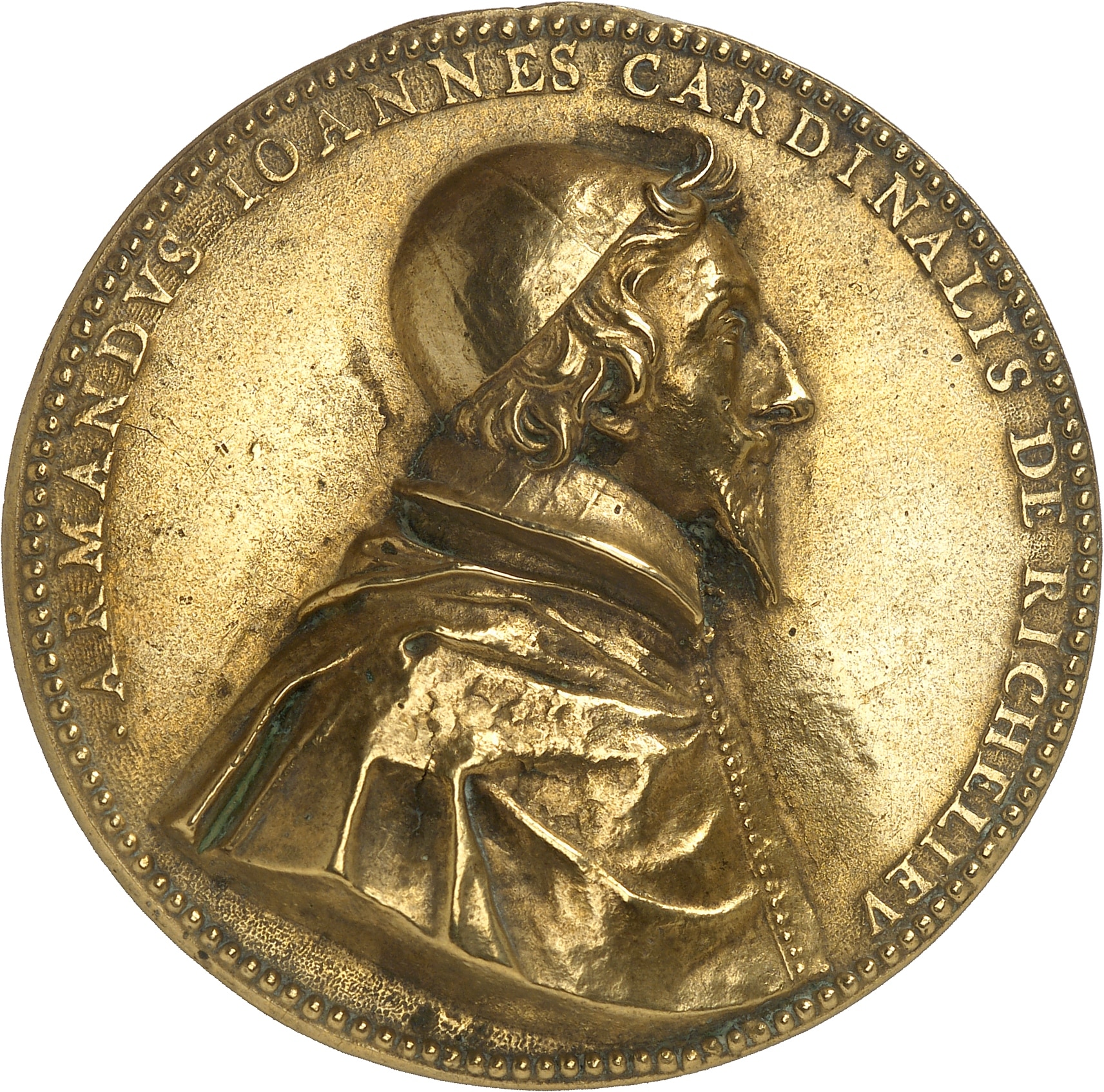 Av. .ARMANDVS IOANNES CARDINALIS DE RICHELIEV (fond des légendes en pointillés). Buste du cardinal de Richelieu à droite.