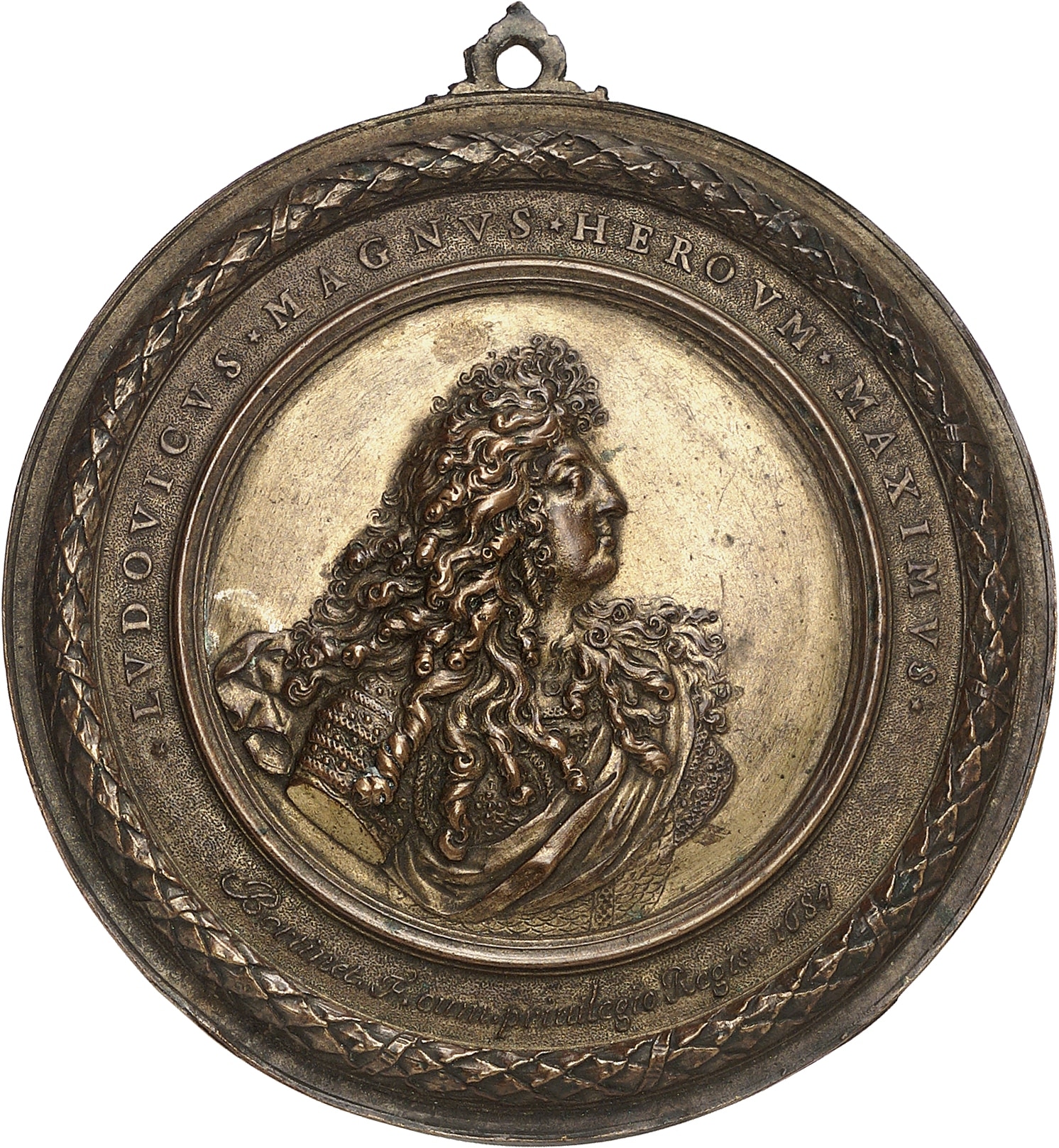 Av. *LVDOVICVS* MAGNVS* HEROVM* MAXIMVS* / Bertinet F. cum. privilegio Regis 1684 en légende extérieure (traitée avec un fond en pointillés), dans une couronne de laurier. Au centre légende dans un cercle : Buste à mi-corps à droite de Louis XIV portant la grande perruque, drapé et cuirassé.