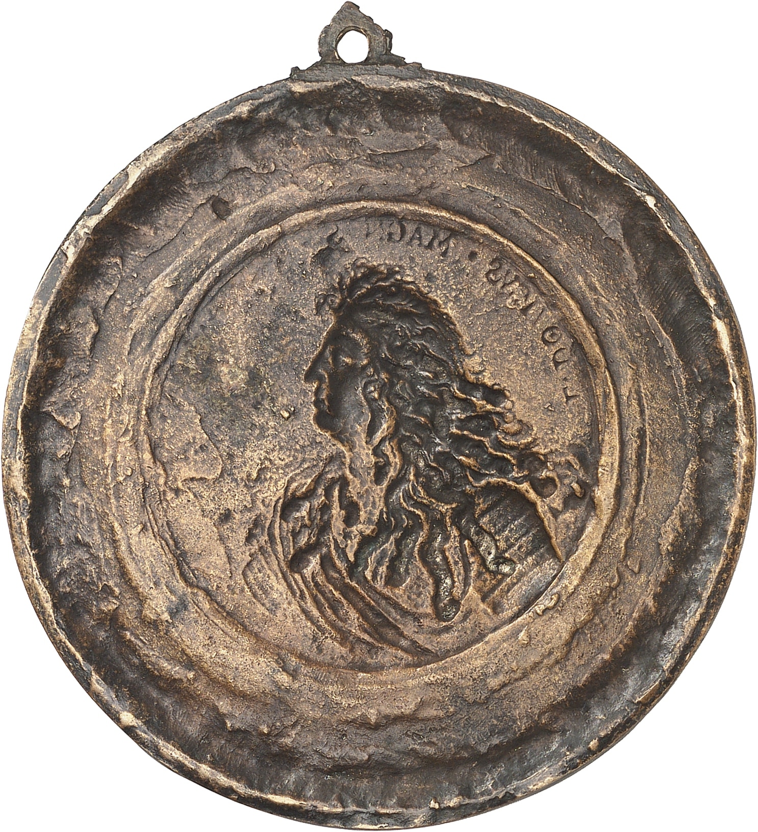 Avec bélière. De remarquable qualité, avec une patine marron-dorée. Rare. Superbe.