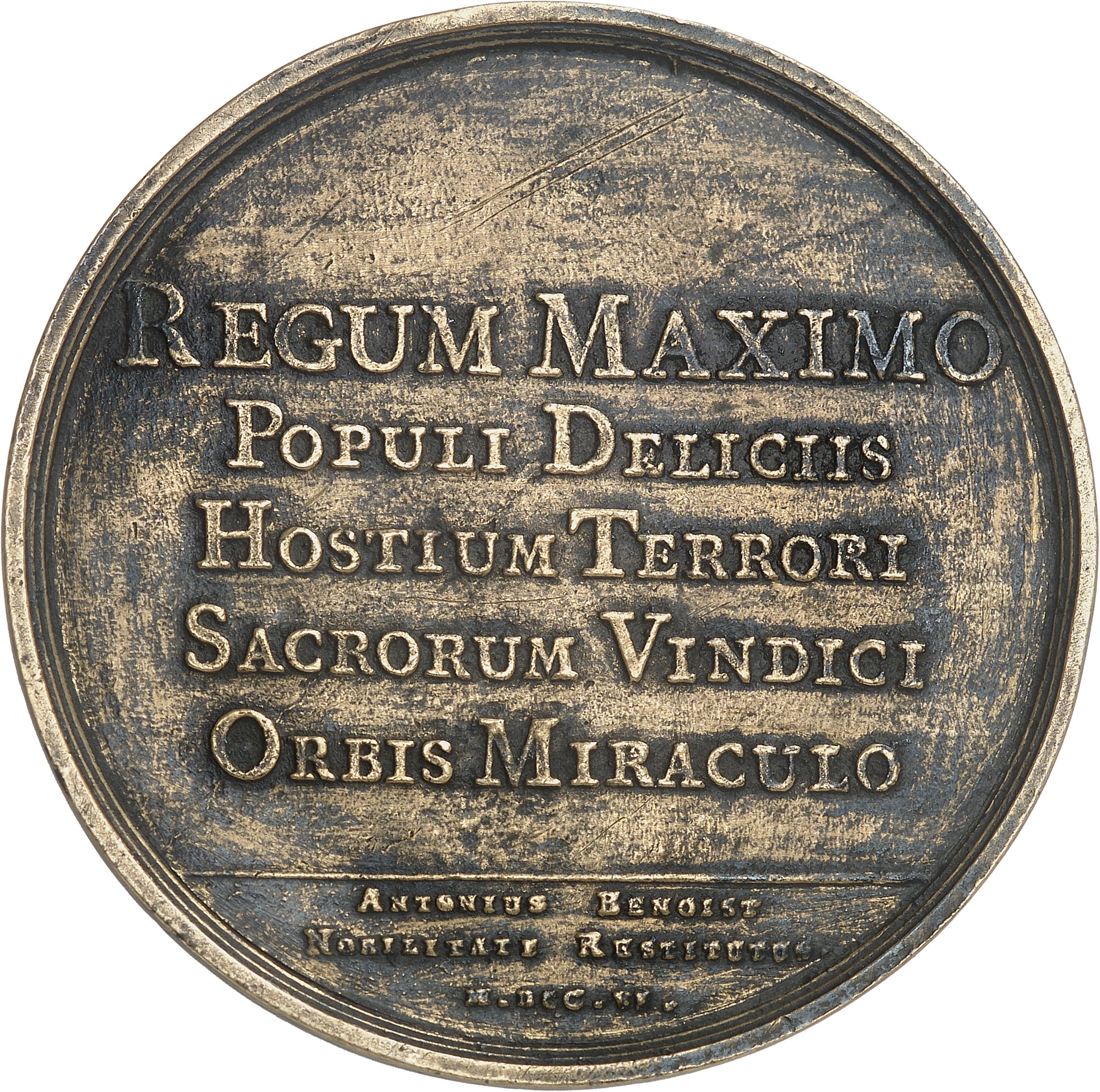 Rv. En cinq lignes dans le champ : REGUM MAXIMO / POPULI DELICIIS / HOSTIUYM TERRORI / SACRORUM VINDICI / ORBIS MIRACULO et à l’exergue : ANTONIUS BENOIST / NOBILITATE RESTITUTUS / (date).