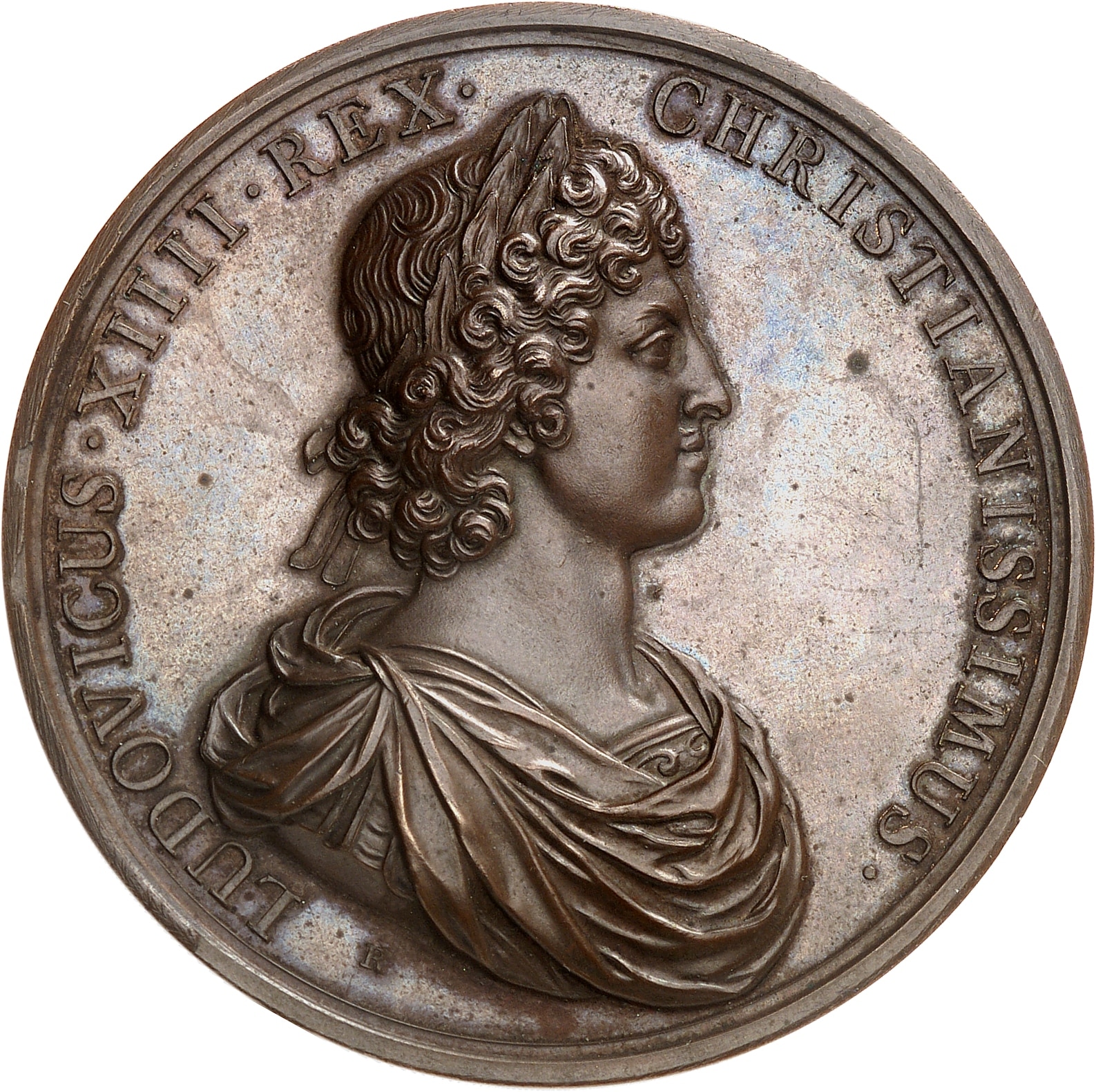 Av. LUDOVICUS. XIIII. REX. - CHRISTIANISSIMUS. Buste adolescent de Louis XIV à droite, lauré, drapé et cuirassé ; au-dessous, signature R.