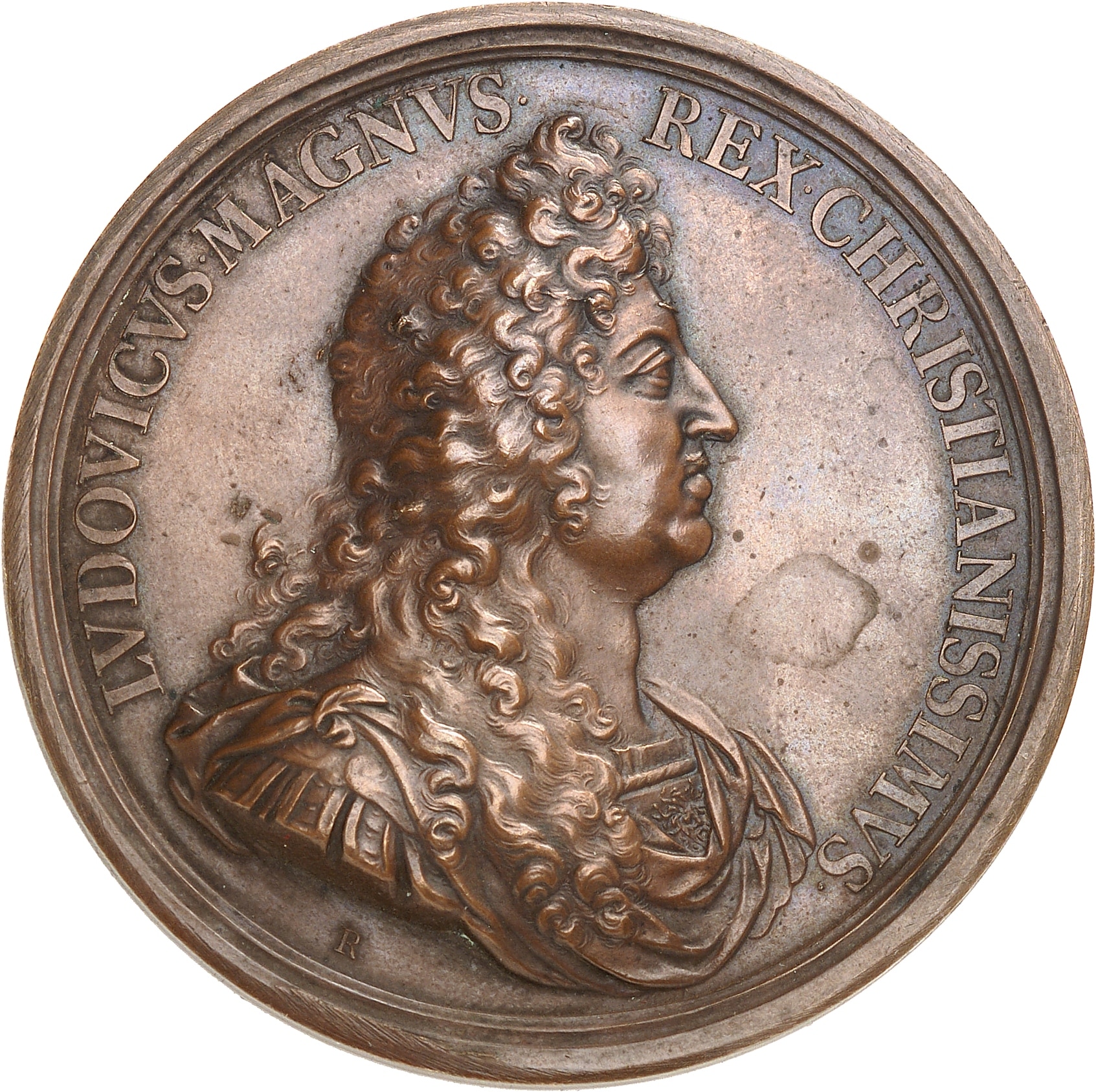 Av. LVDOVICVS. MAGNVS. - REX. CHRISTIANISSIMVS. Buste de Louis XIV à droite, avec la grande perruque, drapé et cuirassé ; au-dessous, signature R.