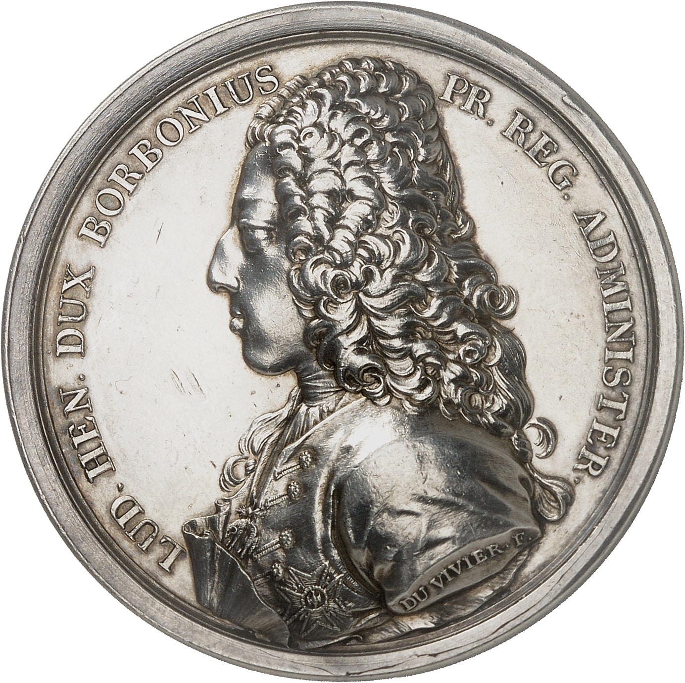 Av. LUD. HEN. DUX BORBONIUS - PR. REG. ADMINISTER. Buste à gauche avec la grande perruque et l’ordre du Saint-Esprit ; au-dessous, signature DU VIVIER F.