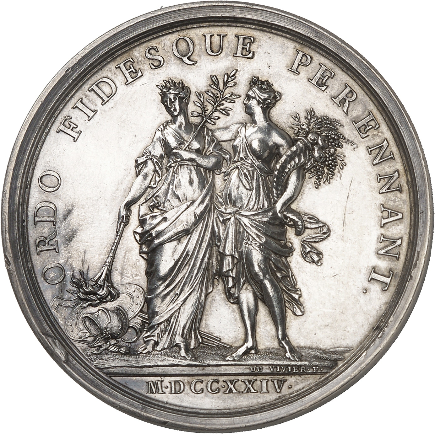 Rv. ORDO FIDESQUE PERENNANT. La Paix avec rameau d’olivier et l’Abondance avec une corne remplie, tenant une torche baissée sur des armes ; signature DU VIVIER F et à l’exergue : (date).