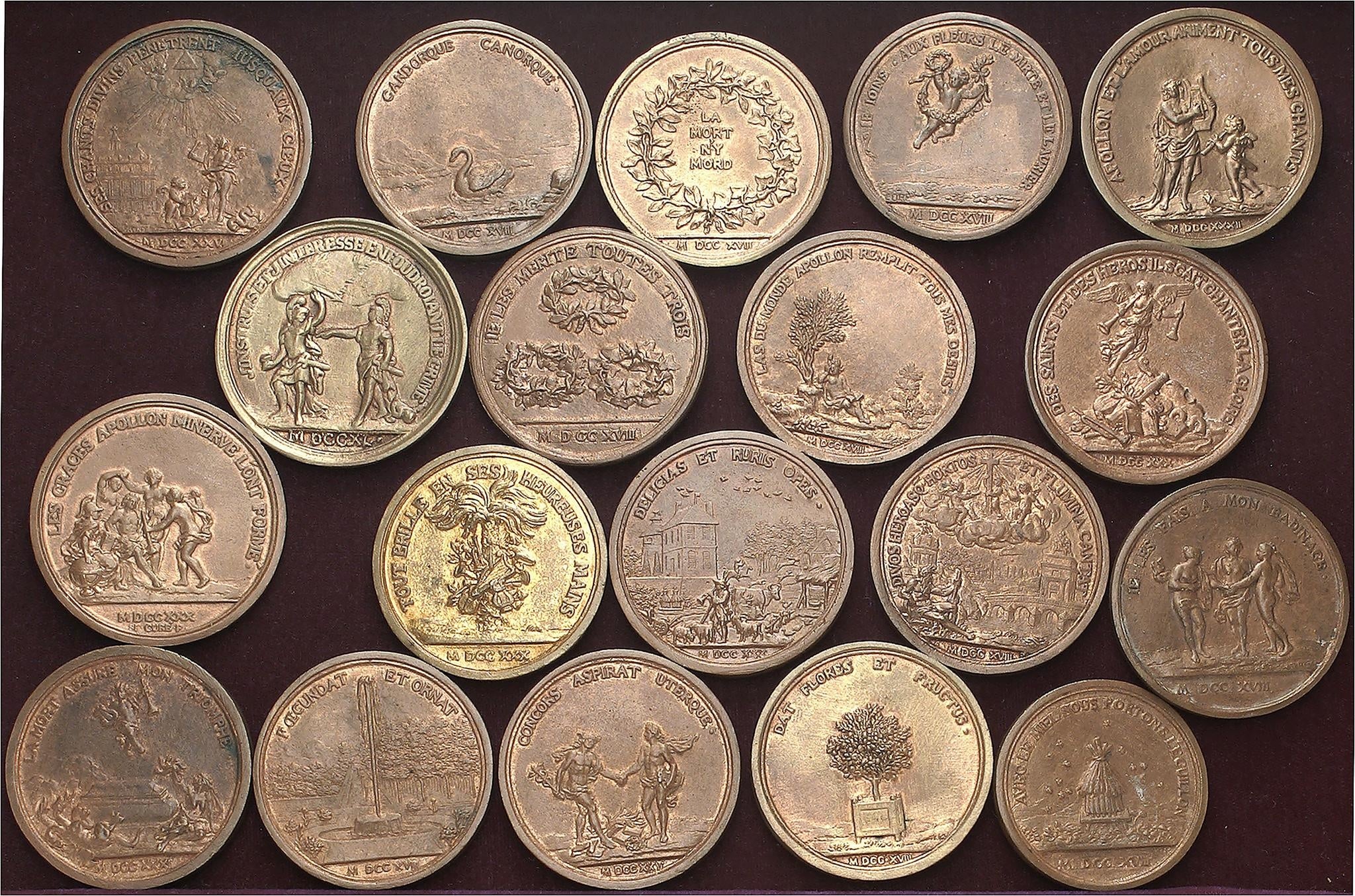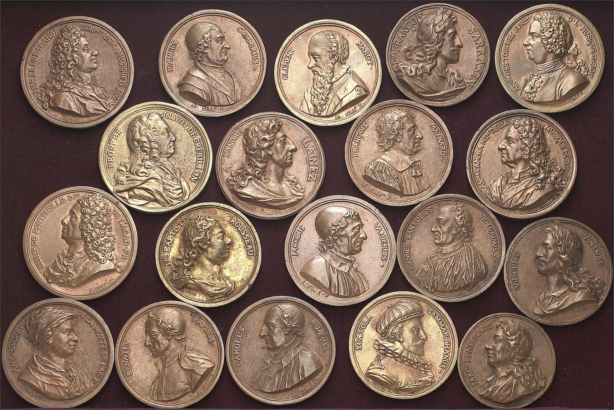 Ensemble de 19 fontes de Simon Curé, de la Série du Parnasse français : Isaac Benserade (1718), André Campra (1730), Jean Commire (1718), Michel-Richard de Lalande (1726), André Destouches (1732), Bernard de Fontenelle (1730), Prosper Jolyot de Crébillon (non signée et datée 1740), Alexandre Lainéz (1718), Clément Marot (1718), François Maynard (1718), Antoine Oudart de La Motte (1731), René Rapin (1718), Jean-Baptiste Rousseau (1730), Charles de La Rue (1725), Scévole de Sainte-Marthe (1718), Jean-François Sarrasin (1718), Jean de Santeul (1718), Jacques Vanière (1730) et Vincent Voiture (1718).
