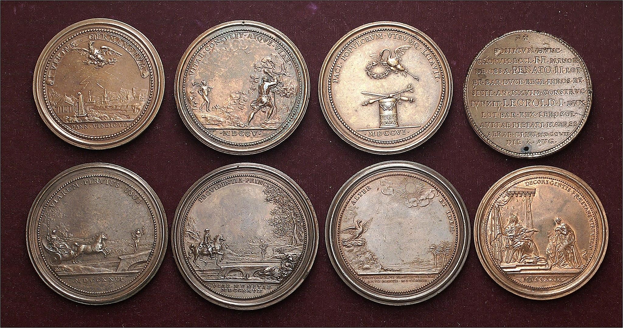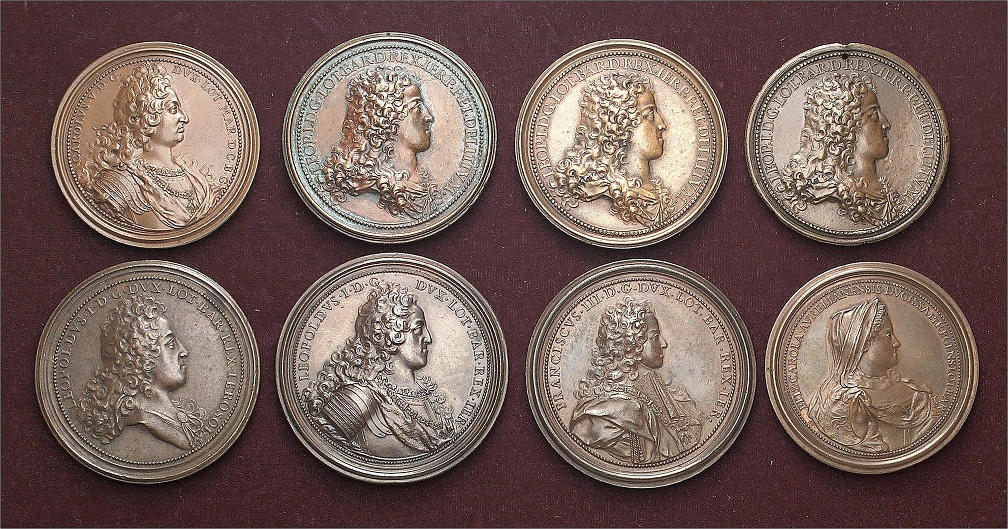 Ensemble comprenant les médailles suivantes : Charles V, expulsion des Turcs de Hongrie (1686) ; Léopold Ier, reconstruction des routes et ponts en Lorraine (1705) ; Léopold Ier, acte de neutralité entre la France et l’Autriche (1706) ; Léopold Ier, réouverture des routes en Lorraine (1726) ; Léopold Ier, reconstruction des ponts en forêt de Haye (1727) ; Léopold Ier, pose de la première pierre de la chapelle des Cordeliers, au Palais ducal (1707) ; François III, le phénix (1729) ; Élisabeth-Charlotte (1729)