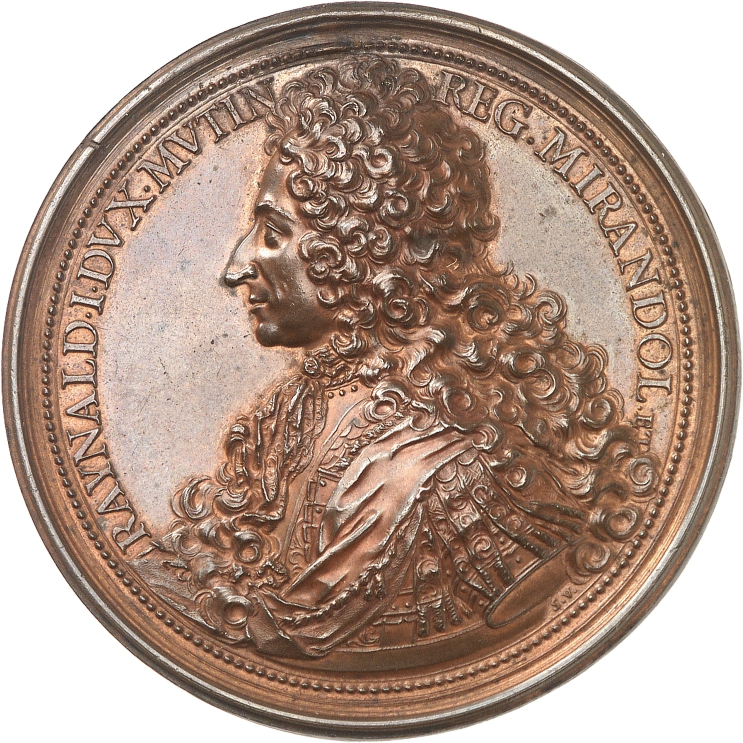 Av. RAYNALD. I. DVX. MVTIN - REG. MIRANDOL. ETC. Buste drapé et cuirassé à gauche, avec la grande perruque ; au-dessous signature S. V.