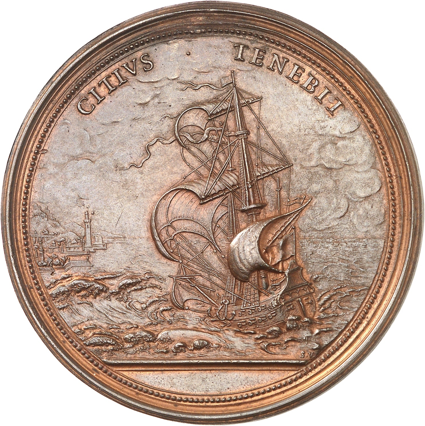 Rv. CITIVS - TENEBIT. Un navire voguant à pleines voiles vers un port ; signature S. V.