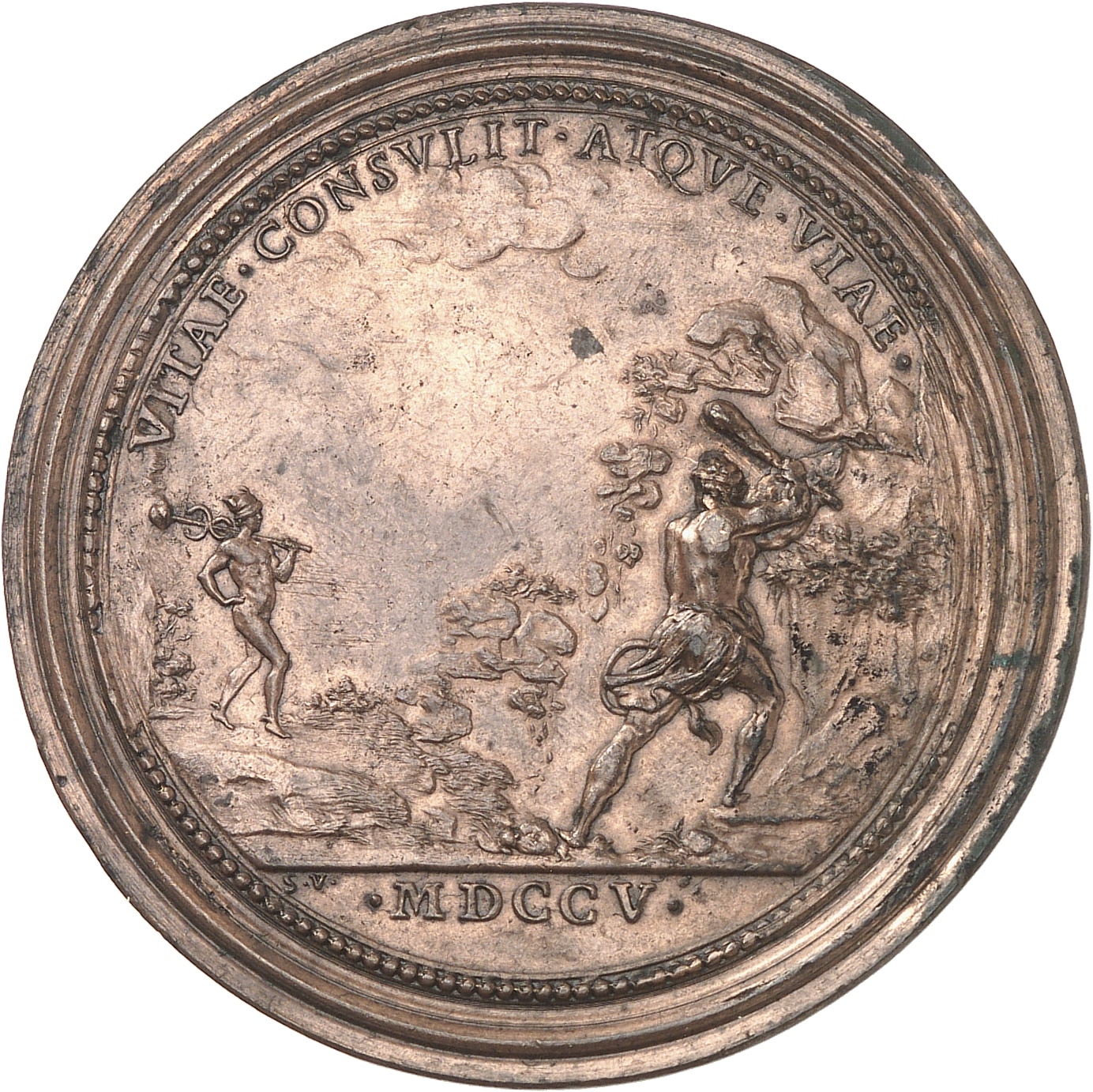 Rv. VITAE. CONSVLIT. ATQVE. VIAE. Hercule abattant de sa massue un rocher dont les débris vont combler une vallée et ouvrant ainsi le passage à Mercure avec son caducée ; à l’exergue (date) et signature S. V.