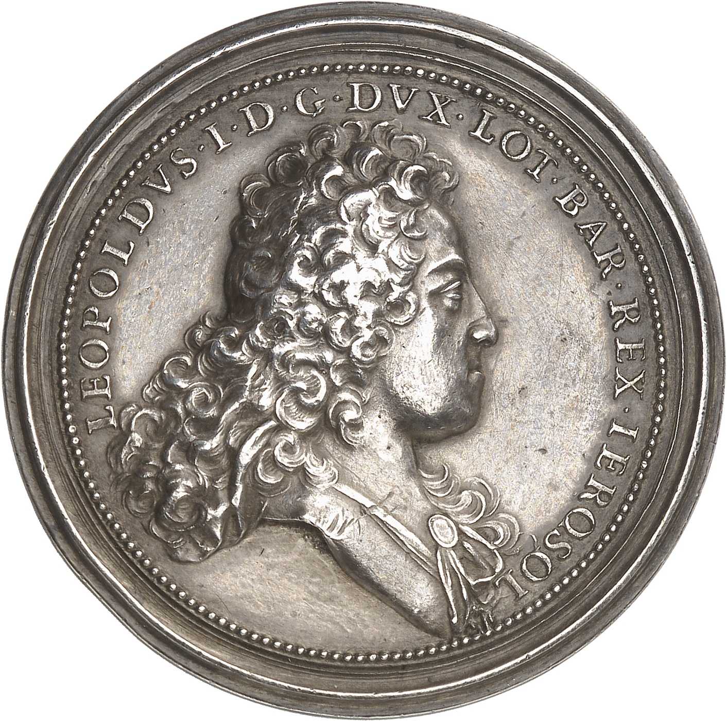 Av. LEOPOLDVS. I. D. G. - DVX. LOT. BAR. REX. IEROSOL. Buste drapé, avec la grande perruque, à droite ; au-dessous, signature S. V.