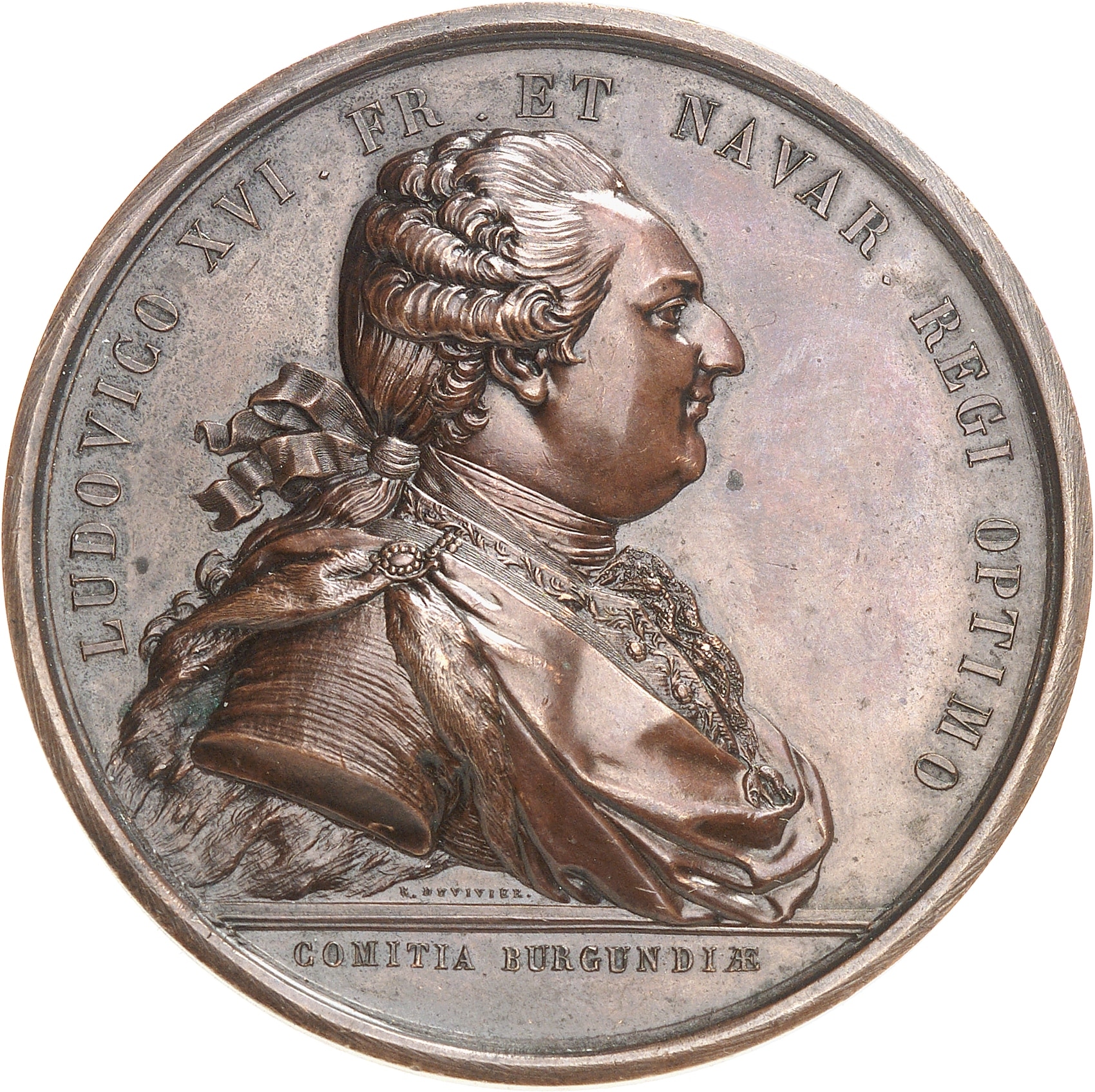 Av. LUDOVICO XVI. FR. ET NAVAR. REGI OPTIMO. Buste cuirassé et drapé du Roi à droite, signature B. DU VIVIER F. ; à l'exergue : COMITIA BURGUNDIÆ.