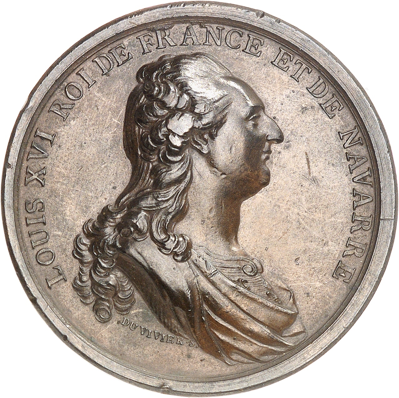 Av. LOUIS XVI ROI DE FRANCE ET DE NAVARRE. Buste drapé et cuirassé à droite de Louis XVI ; au-dessous, signature DU VIVIER S.