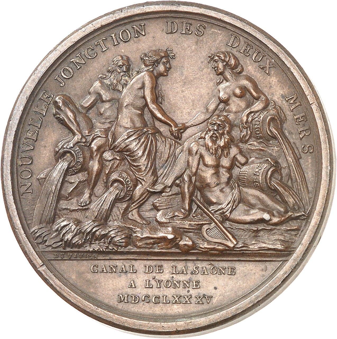 Rv. NOUVELLE JONCTION DES DEUX MERS. Deux fleuves, le Rhône et la Saône rencontrent les deux fleuves Seine et Yonne ; signature DU VIVIER ; à l'exergue : CANAL DE LA SAÔNE/ A L'YONNE/ MDCCLXXXV.
