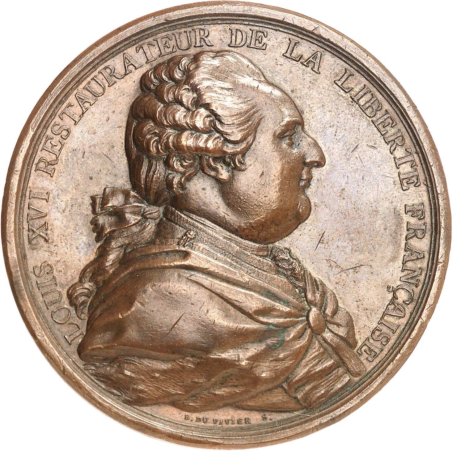Av. LOUIS XVI RESTAURATEUR DE LA LIBERTÉ FRANÇAISE. Buste du Roi Louis XVI à droite ; au-dessous, signature B. DU VIVIER S.
