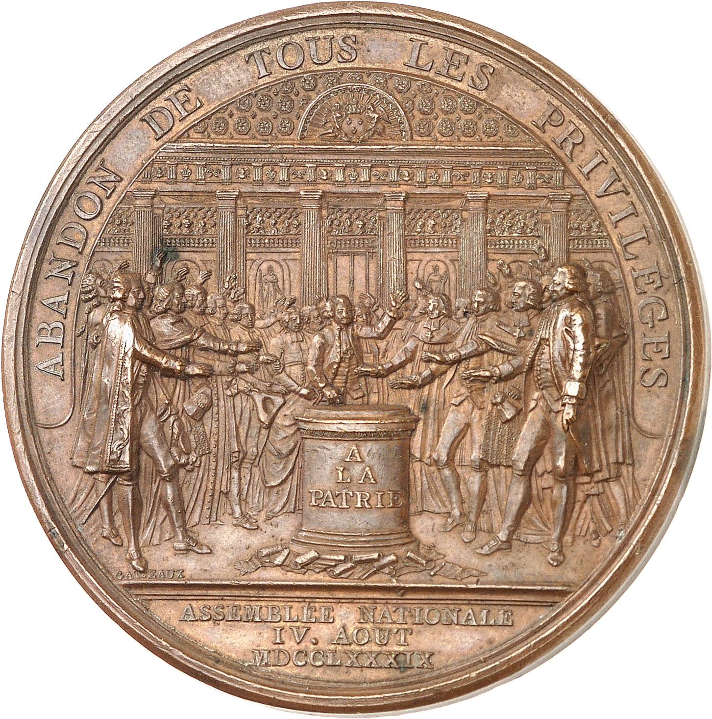Rv. ABANDON DE TOUS LES PRIVILÈGES. Scène de l'abandon des privilèges dans la nuit du 4 août 1789 avec un autel inscrit A/ LA/ PATRIE ; signature GATTEAUX ; à l'exergue : ASSEMBLÉE NATIONALE/ IV. AOUT/ MDCCLXXXIX.