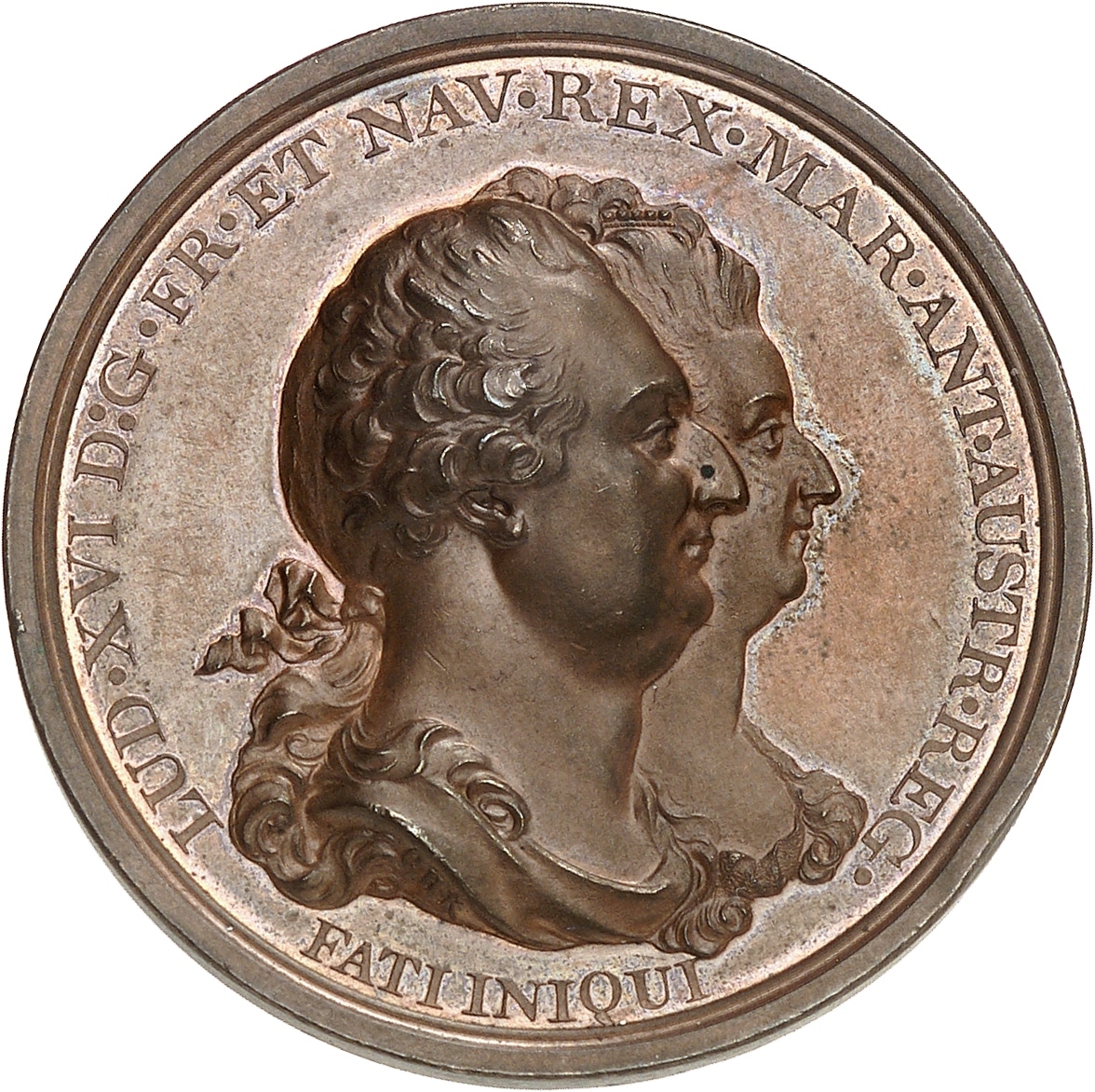 Av. LUD. XVI D: G. FR. ET NAV. REX. MAR. ANT. AUSTR. REG. Buste accolés à droite de Louis XVI et de Marie-Antoinette ; au-dessous FATI INIQUI ; signature C. H. K. sur l’épaule.